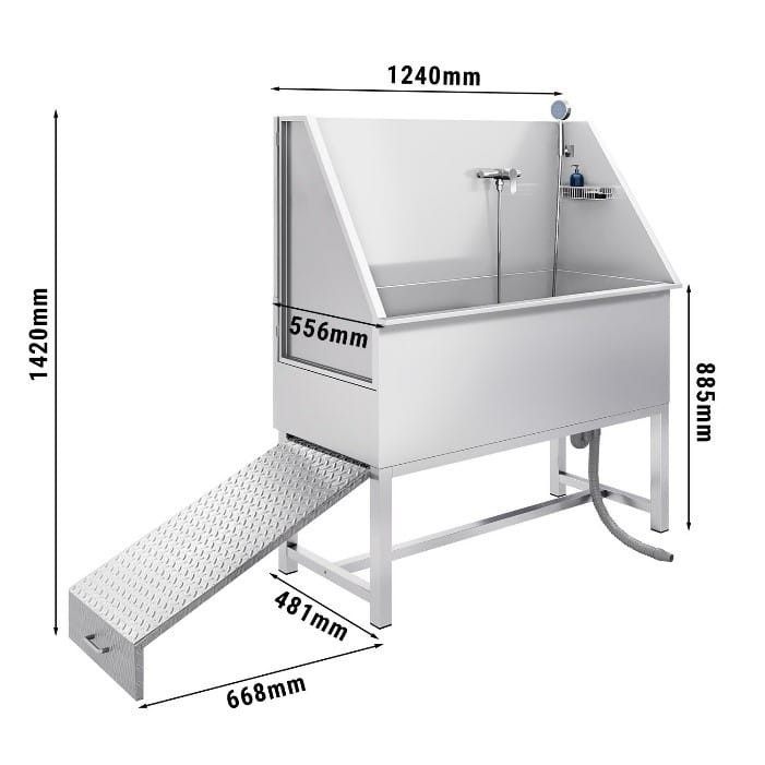 Bañera para mascotas de acero inoxidable con suelo en chapa perforada, rampa lateral y grifo (REF. BAÑ003)