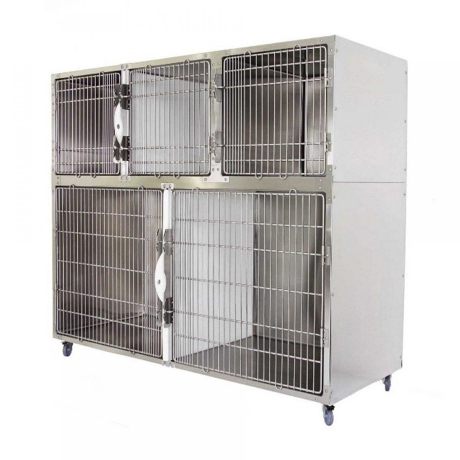 Jaula de 5 departamentos de acero inoxidable con ruedas con freno y separador en parte superior e inferior, para hacer una jaula de doble dimensión, con terminaciones redondeadas para facilitar su limpieza y cierres de seguridad.