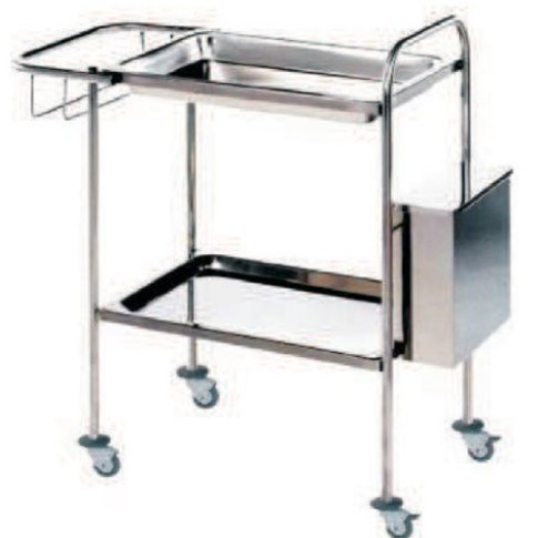 Carro de curas de acero inoxidable con ruedas, soporte para bombonas, papelera y bandejas desmontables.