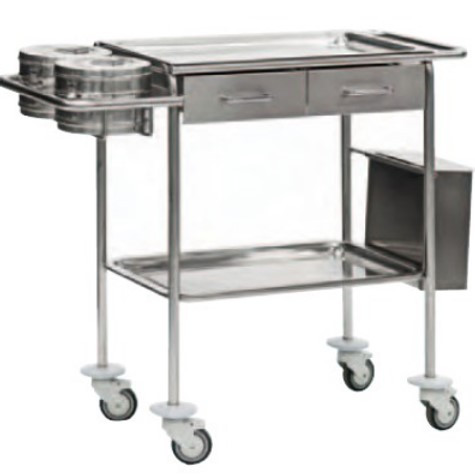 Carro de acero inoxidable con ruedas giratorias, 2 bandejas desmontables, papelera, 2 cajones y empujador en un lateral para facilitar su desplazamiento.