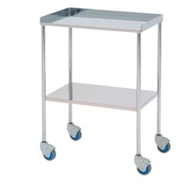 Mesa auxiliar con estructura cromada, entrepaños y ruedas giratorias de 80 mm.