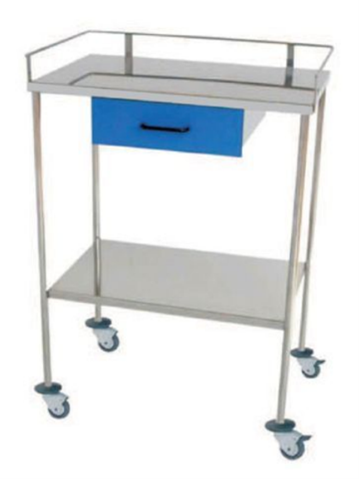 Mesa auxiliar para instrumental en acero inoxidable con 1 cajón y balda inferior, ruedas giratorias y barandilla en balda superior.