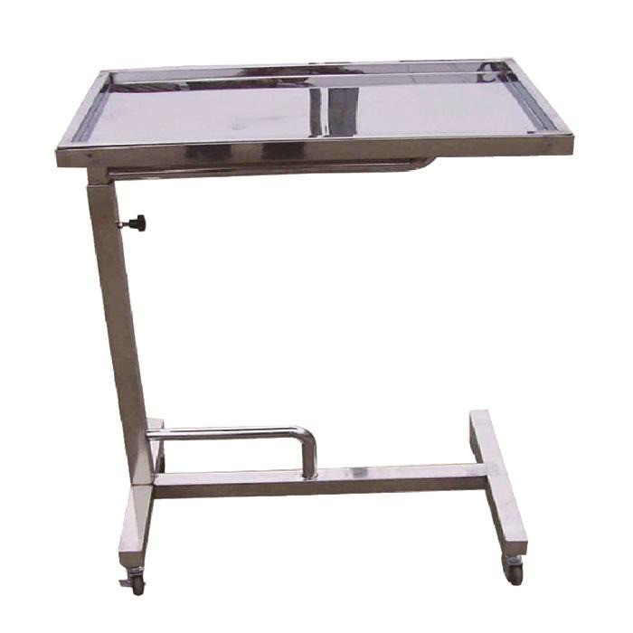 Carro auxiliar para instrumental quirúrgico fabricado en acero inoxidable con ruedas y regulable en altura manualmente.