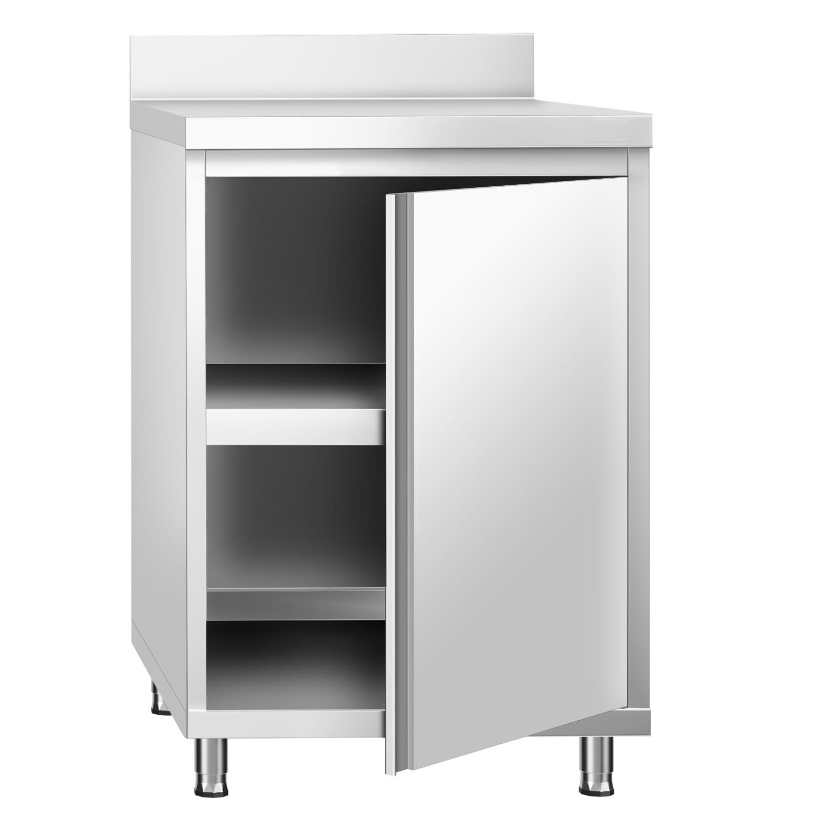 Armario de trabajo en acero inox. con puerta batiente y zócalo. Dispone de estante intermedio de altura regulable.
